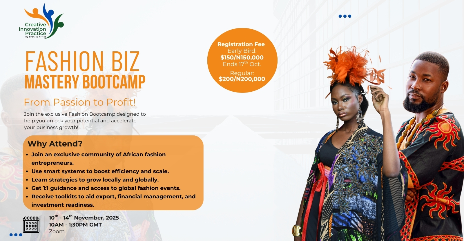 Creative Innovation Practice by EyeCity Africa invites 50 fashion entrepreneurs across Africa to join the Fashion Business Mastery Bootcamp (FBMB), happening from November 10th to 14th, 2025, between 10:00 AM and 1:30 PM GMT daily.